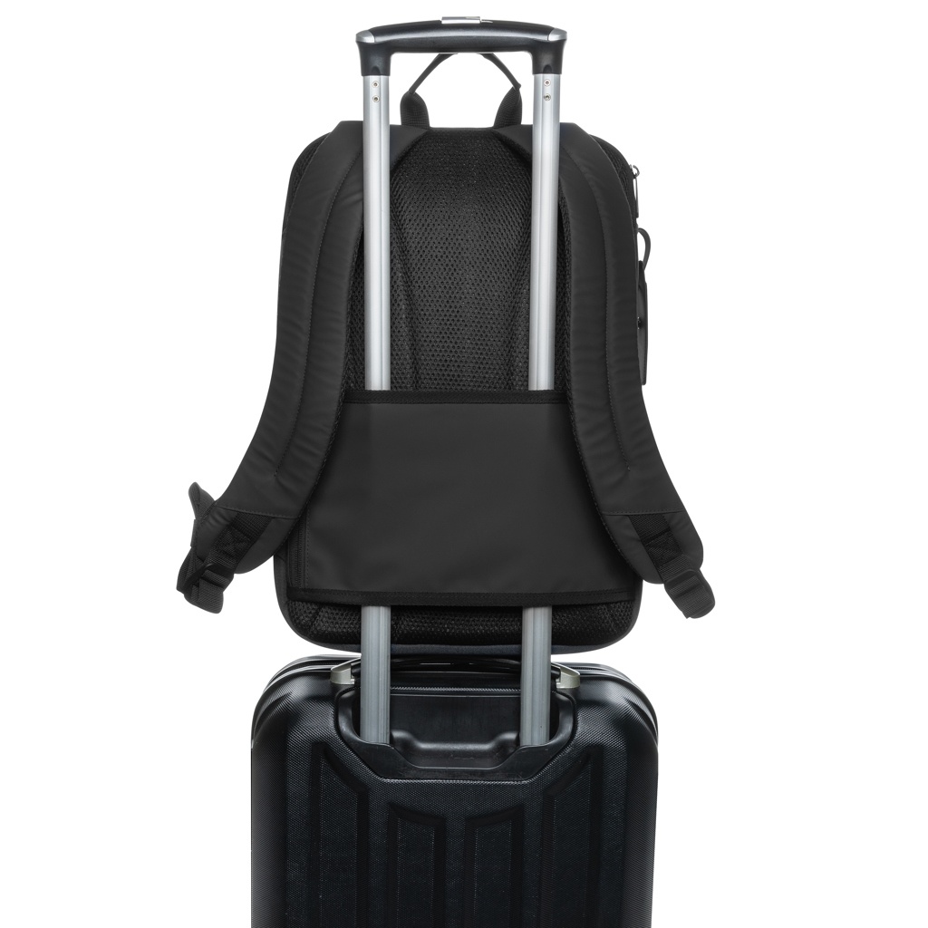 Den rena designen gör ryggsäcken mycket mångsidig och idealisk för både arbete och fritid. Den är stilig nog för styrelserummet, men erbjuder ändå all den bekvämlighet och komfort som en ryggsäck har. Vadderat laptopfack med plats för 15.6" laptop. Plocka enkelt fram viktiga saker som pass, biljett eller smartphone i säkerhetskontrollen via den praktiska, lättåtkomliga toppfickan. De invändiga nätfickorna håller ordning på dina småsaker. Det finns en bagagetagg på sidan. Tillverkad av återvunnen polyester med AWARE™-spårning. 2% av intäkterna från varje såld produkt med AWARE™ kommer att doneras till Water.org. PVC-fri.