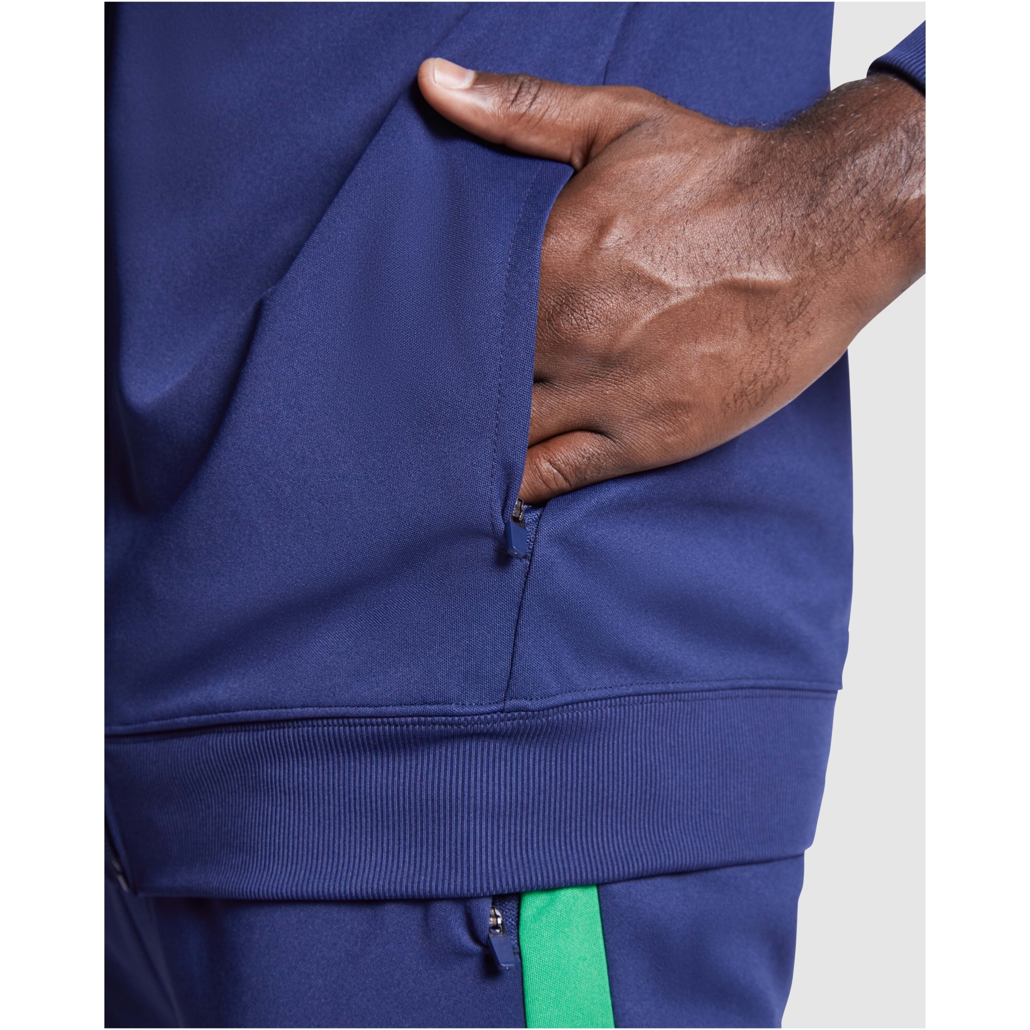Träningsoverall i lätt och elastiskt tyg. Jacka med kontrasterande färg och sömnadsband på bröstet. Hög krage med kontrasterande sömmar. Dragkedja mitt fram. Sidofickor. 2 x 2 ribbade muddar och midja. Byxor med elastisk linning och dragsko. Kontrasterande sidostycke med sömnadskant. Dragkedja i fåll.