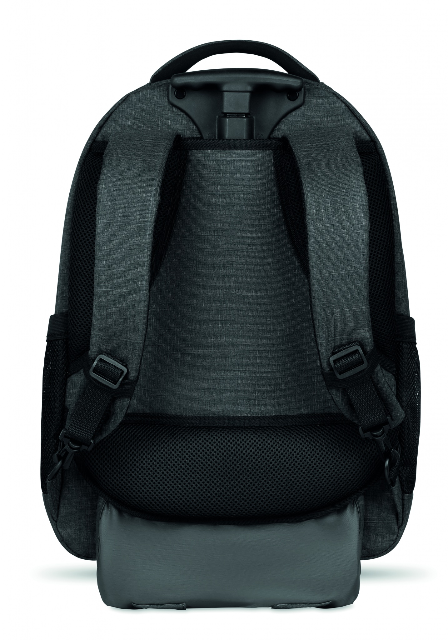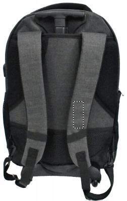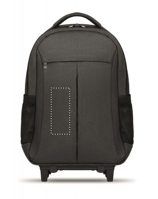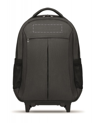 Ryggsäck med trolley-hjul i 360D polyester. Innehåller ett fack för 15 tums bärbar dator och en framficka med dragkedja. Vadderat i ryggen och på axelremmarna. Det finns även ett fack för ev. surfplatta. Har även ett skydd för hjulen när den bärs på ryggen för att undvika att smutsa ner kläderna.
