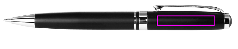 Högkvalitativ metallpenna i matt svart, med blanka silverapplikationer och elegant fodral. Vi kommer att gravera din logotyp under klippet.