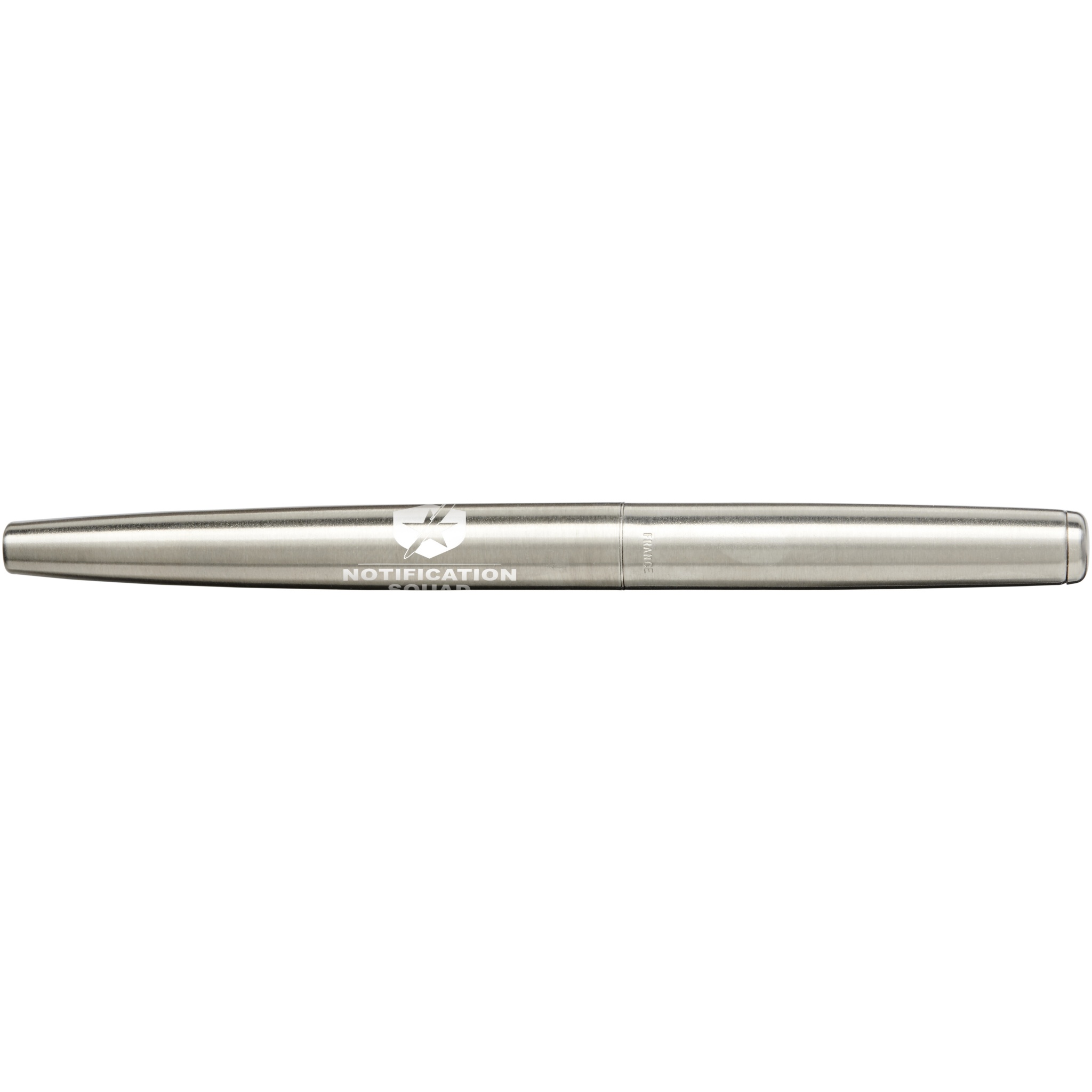 Jotter reservoarpenna. Jotter reservoarpenna är en modern tolkning av den ursprungliga ikonen. Med en spets i rostfritt stål, förkromad pennkropp, kork i polerat rostfritt stål och pilklämman. Den levereras i en Parker presentförpackning. Metall.