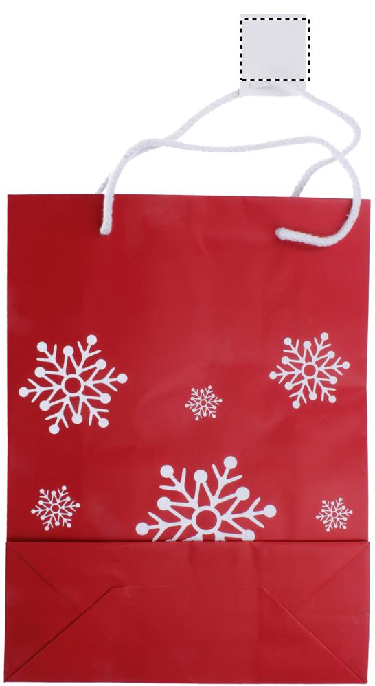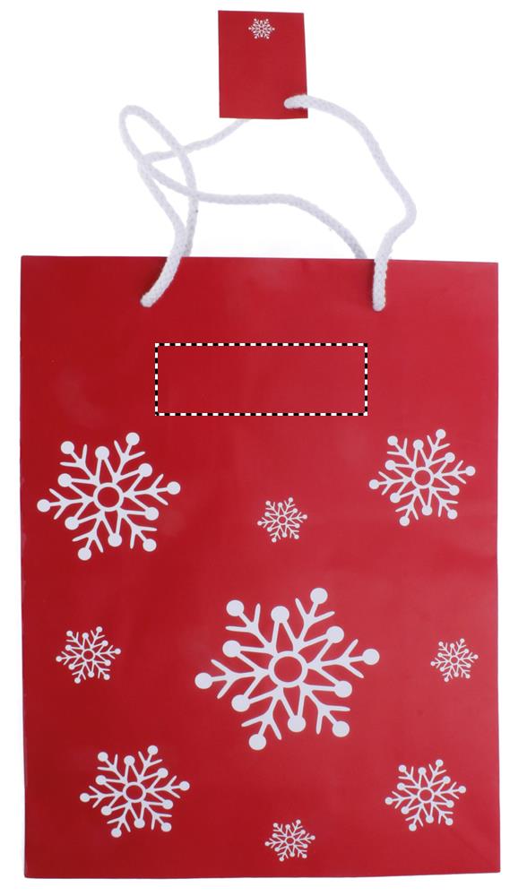 Elegant papperspåse med snöflingor mönster. Presenthälsningskort på handtaget. 36 cm hög.