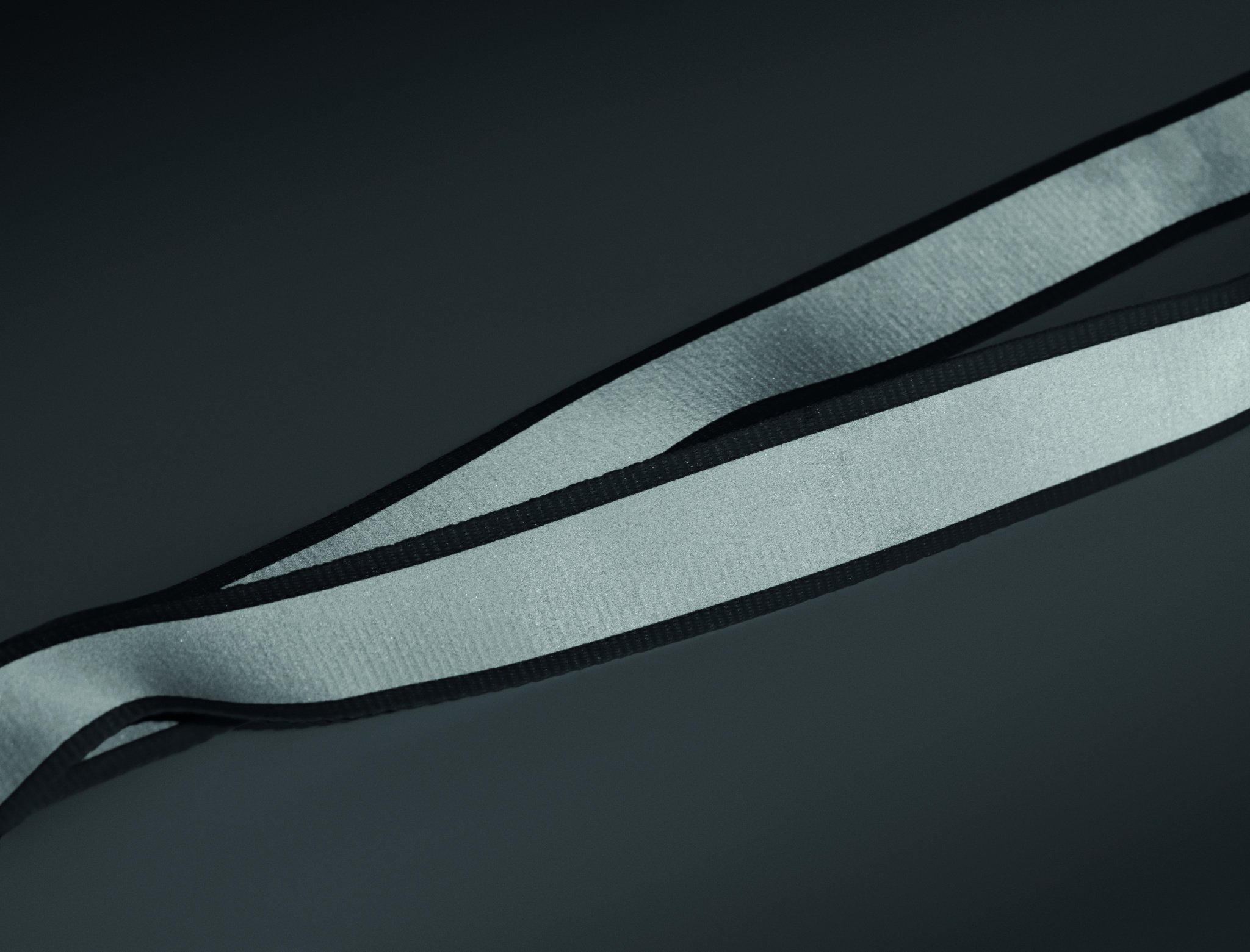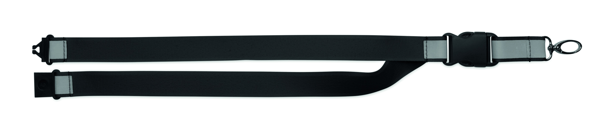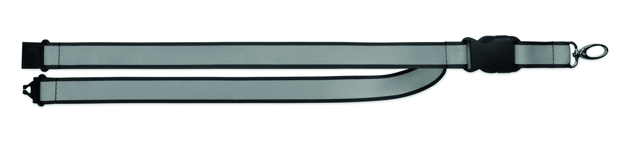Reflekterande logoband i RPET-polyester. 2,5cm breda band, metallkrok, avtagbart PP-spänne och säkerhetsspärr. Endast för reklamanvändning.