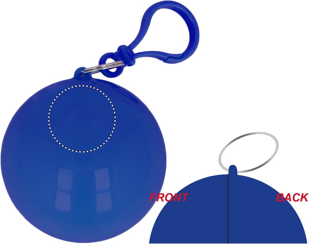 Transparent PE poncho i en boll i AS-plastskal med karbinhake att hänga på ett bälte eller en väska. Kan endast tryckas på plastbollen.