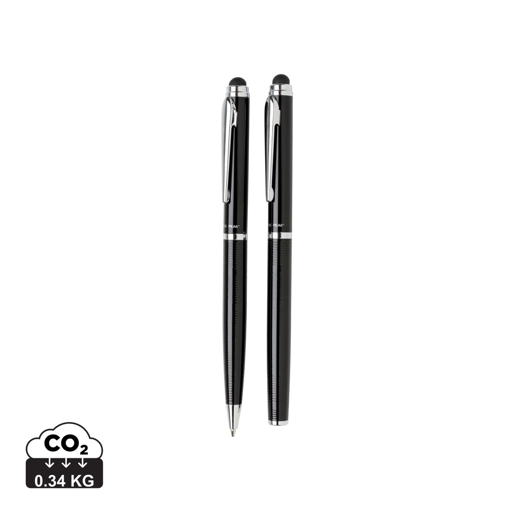 Pennset med kulspetspenna och rollerballpenna, bägge med stylusfunktion. Exklusiv design med vackert linjemönster på kroppen. Inklusive Swiss Peak presentförpackning.