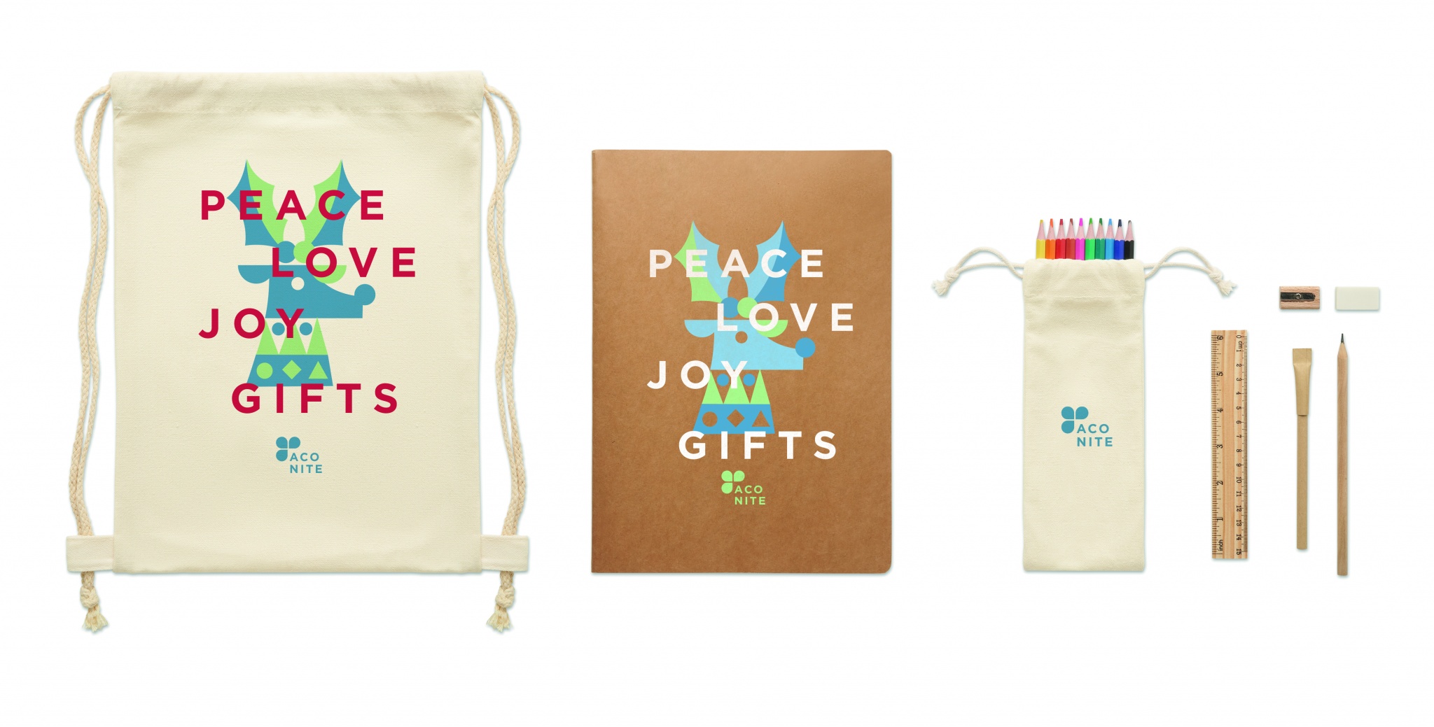 Teckningsset för barn med 5 delar med linjal i trä, vässare i trä, suddgummi, träpenna och kulspetspenna i kartong. Ytterligare 10 färgpennor, återvunnet A4-papper med 50 vanliga ark (100 sidor). Presenteras i en väska med dragsko i bomull.