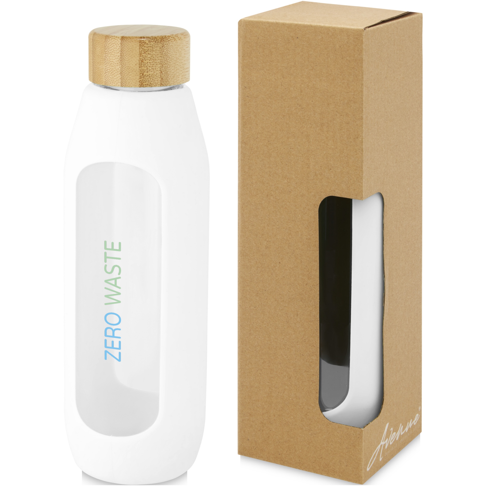Miljövänlig återanvändbar vattenflaska som ger en ren drickupplevelse. Flaskan är tillverkad av hållbart borosilikatglas som bevarar den rena verkliga färska smaken av vatten och innehåller inga skadliga kemikalier. Innehåller ett silikongrepp med ett läckagesäkert lock av ekologisk bambu. Testad och godkänd enligt tysk lagstiftning om livsmedelssäkerhet (LFGB) och testad för ftalatinnehåll enligt REACH-förordningarna. Volymkapacitet 600 ml. Genom att ta bort greppet och locket tål flaskan maskindisk. Levereras i en återvunnen presentförpackning av kartong.