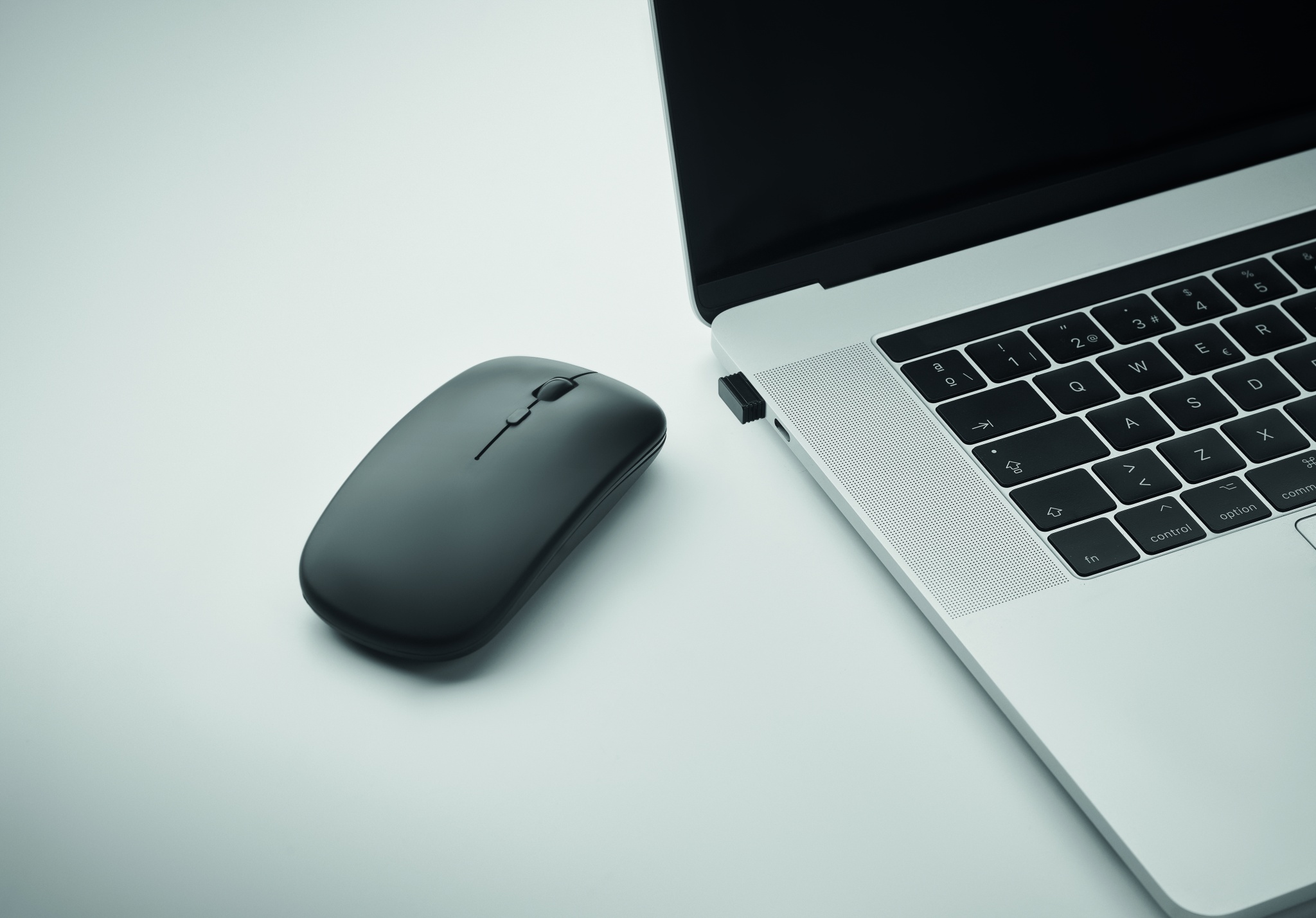 Optisk trådlös mus i återvunnen ABS med uppladdningsbart 500 mAh batteri.