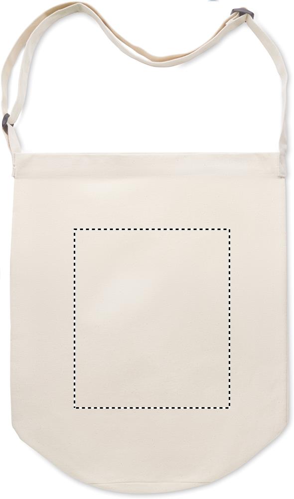 Kasse i naturfärgad canvas med lång justerbar axelrem och stor framficka med tryckknappstängning. Har innerficka. 270 gr/m².