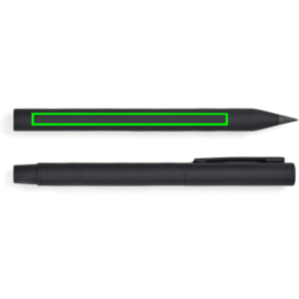 Detta moderna och stilrena set innehåller två pennor: en evighetspenna och en klassisk kulspetspenna med lock och klämma. Båda pennorna är designade med stil och funktionalitet i åtanke, tillverkade av RCS-certifierat återvunnet rostfritt stål och försedda med en gummiyta för ett bekvämt grepp och en matt finish. Med en balanserad vikt ligger de skönt i handen och gör skrivandet bekvämt och stabilt. Evighetspennan erbjuder obegränsat skrivande, medan kulspetspennan har en spets på 1,00 mm och ger en jämn och konsekvent skrift med dokumentblått bläck som räcker upp till 1200 meter. Certifierad enligt RCS (Recycled Claim Standard), RCS-certifieringen garanterar att hela leveranskedjan av återvunna material är certifierad. Det totala återvunna innehållet baseras på produktens totala vikt. Denna produkt innehåller 52 % RCS-certifierat återvunnet aluminium och 10 % RCS-certifierat rostfritt stål.